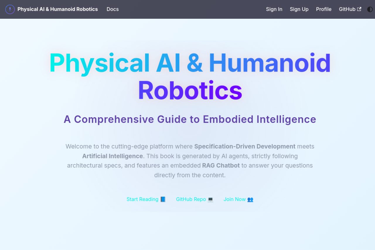 AI-Driven & Spec-Driven Hackathon project — an interactive book combining Docusaurus documentation UI with a FastAPI RAG (Retrieval-Augmented Generation) backend for Physical AI & Humanoid Robotics.